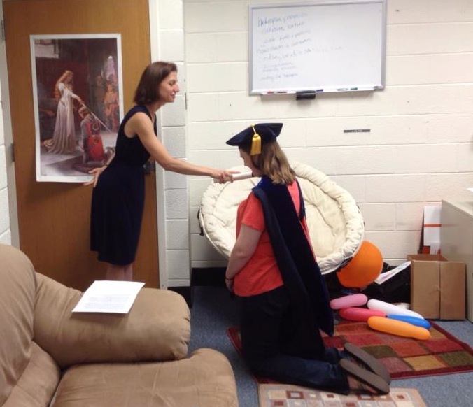 Bethany 'knighting' Meghan Cody, fulfilling a seven-year dream